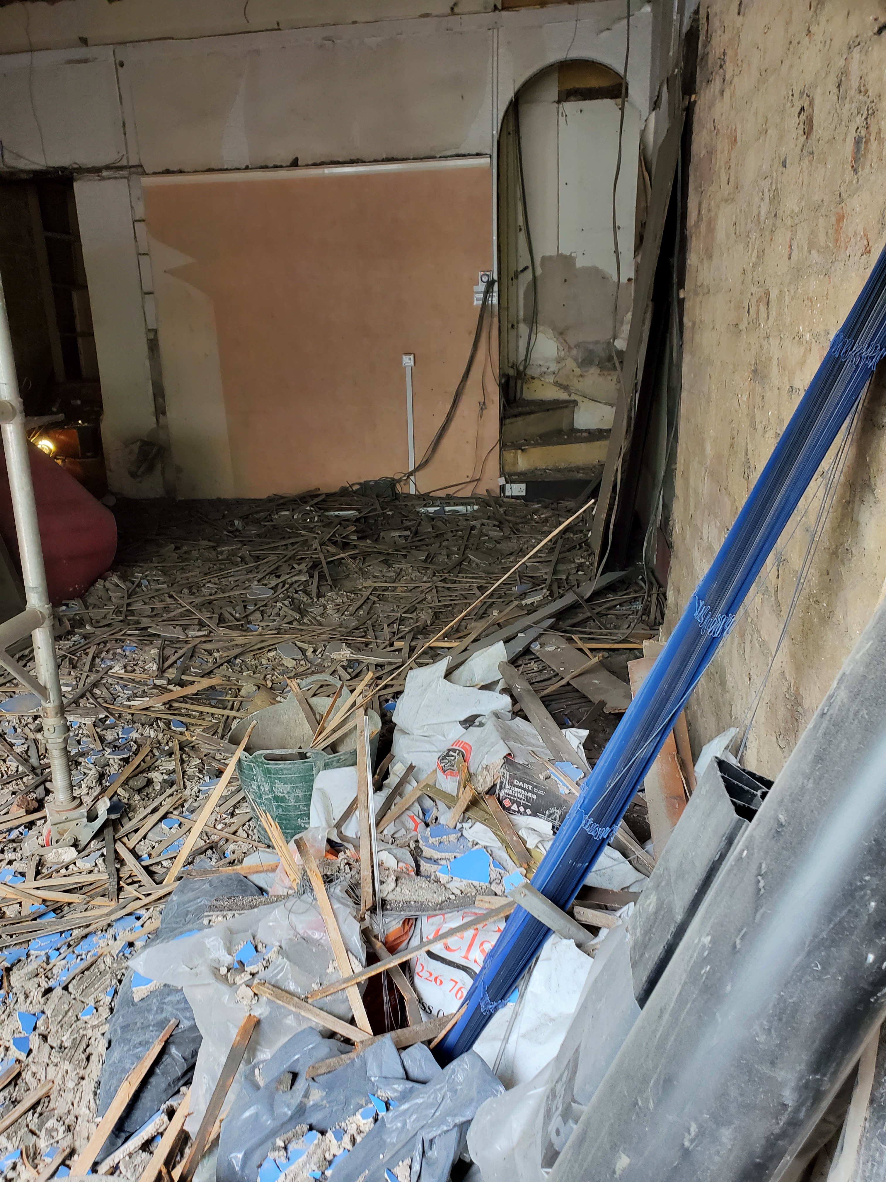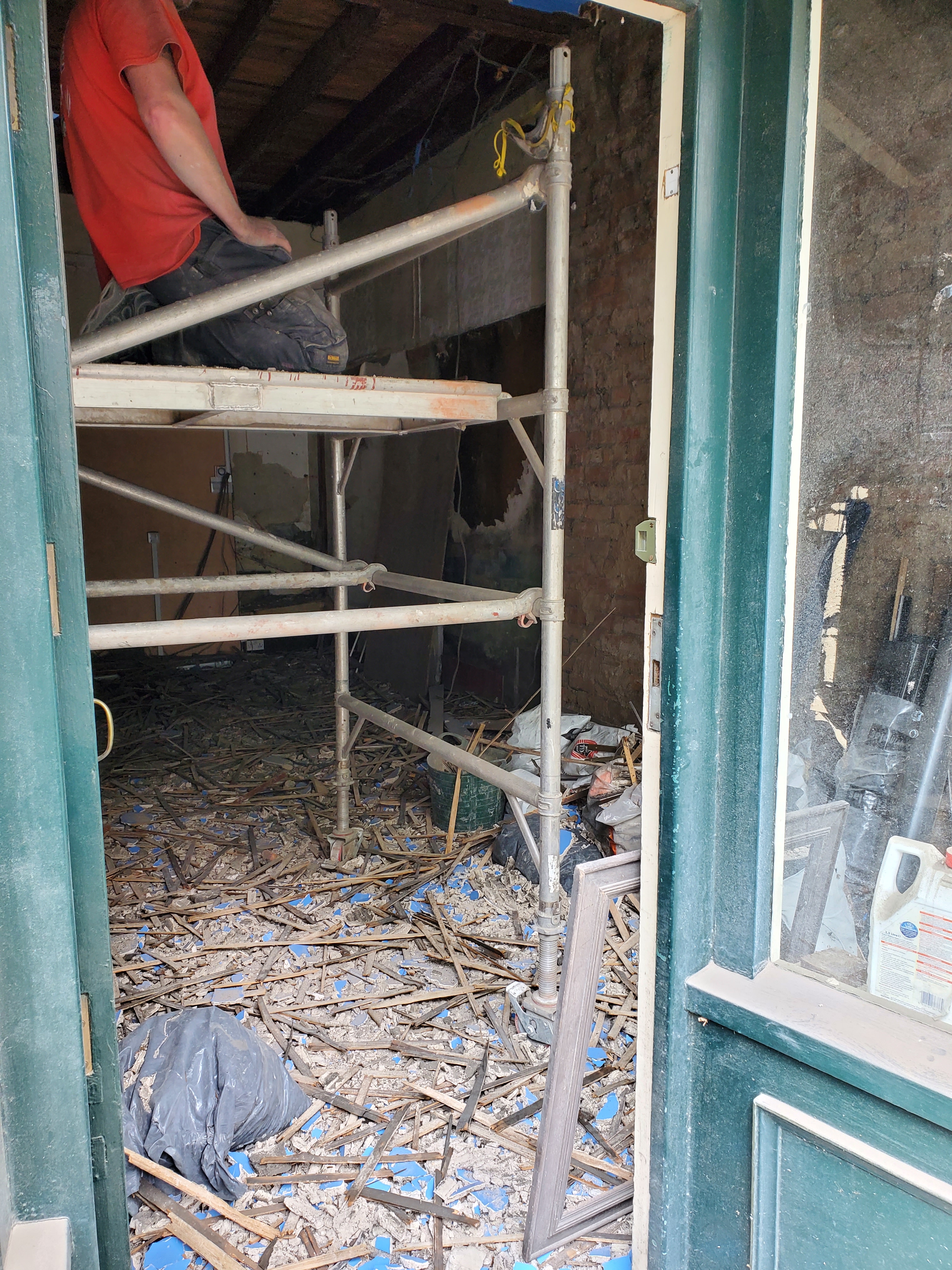 The structural engineer’s concerns about the bouncy floor upstairs led to the very difficult decision to take down the rather unstable lath and plaster ceiling. A good decision in the end, as the beams supporting the floor above were the half the thickness they should be, hence the bounce and we can now feel confident that the floor will safely support a crowd of creatives creating. The resulting debris from the 100 year old ceiling being taken down was temporarily stacked and stashed on the back patio until the skip arrived.