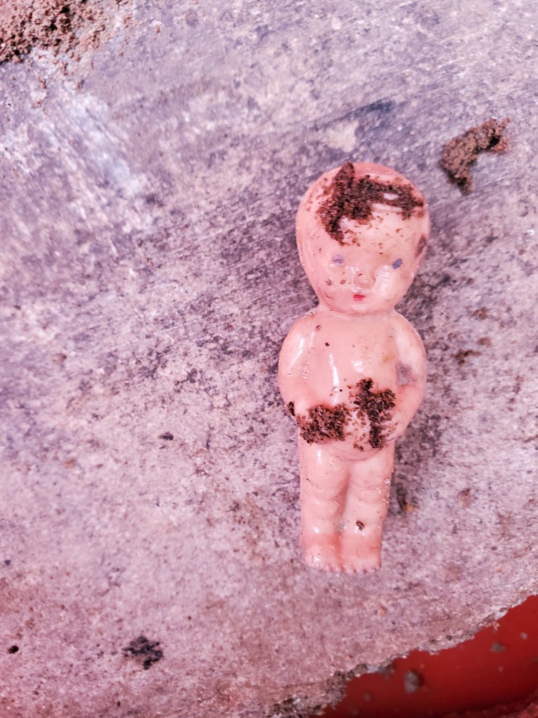A little research established it is an early celluloid ‘kewpie’ doll. Likely dropped by a small child through a gap in the floorboards. How it survived being buried amongst a ton of bricks and shovelled back and forth is something and quite the achievement. A metaphor for surviving against the odds, a little piece of incredible resilience. It will be given a new home in the therapy space where visitors can ponder its mysterious story.