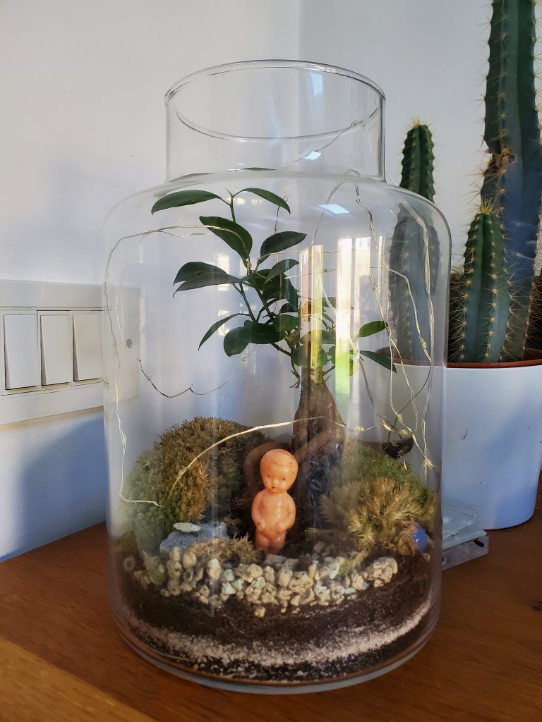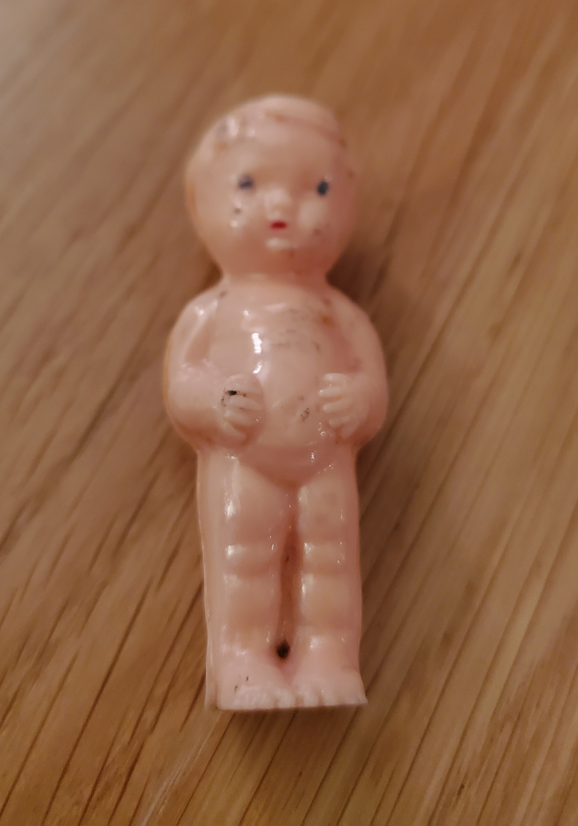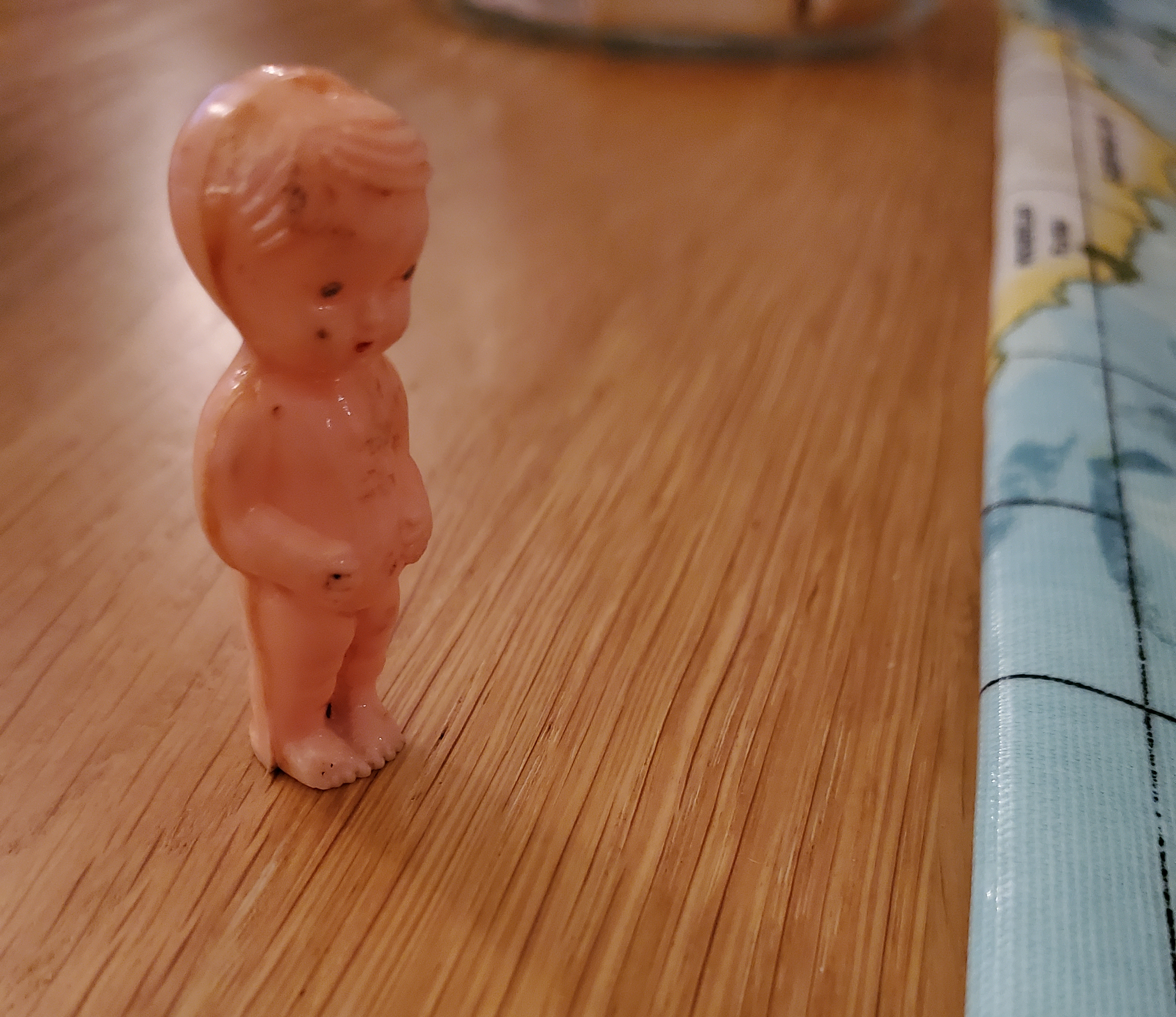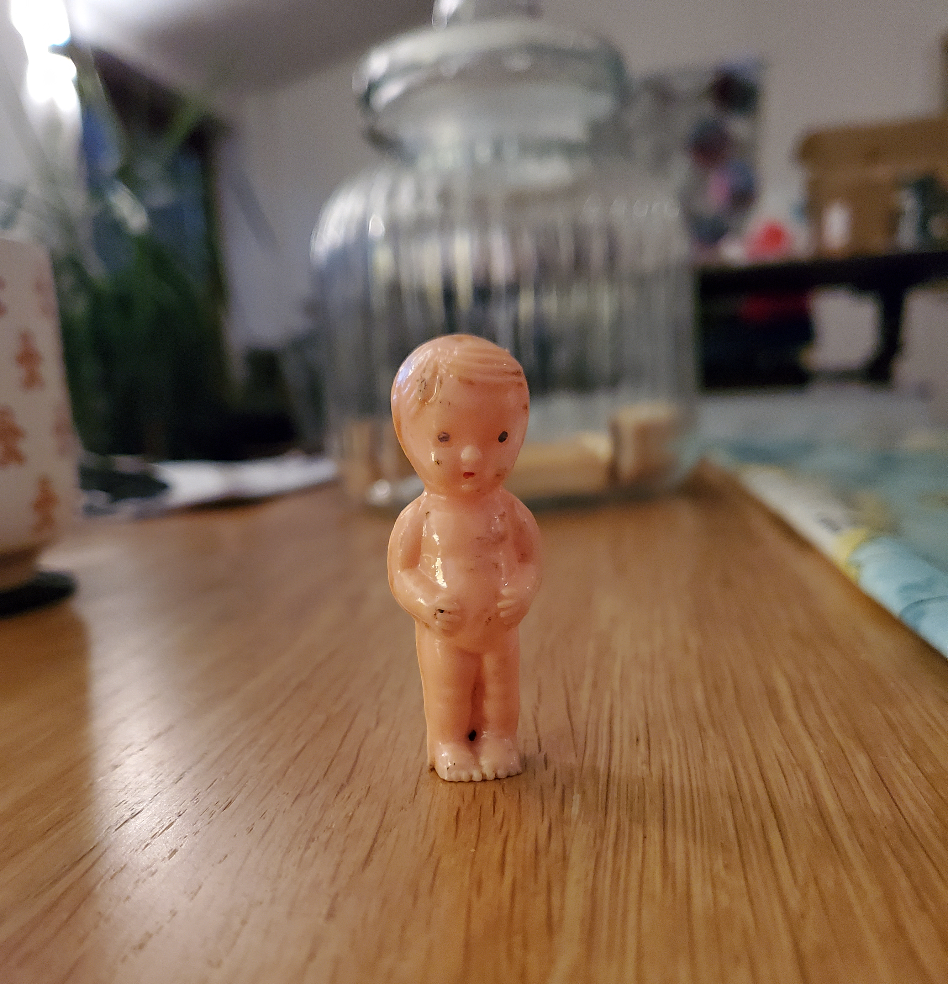 To save a few pennies in the runaway budget, we took up the job of transferring the sooty wood and plaster mountain to the skip ourselves. Messy, muscle-making work but happy we did. Mid filling yet another barrow, something stood out of the rubble. Looking closer, emerging from the thick dirt, a tiny two inch figure of a baby.